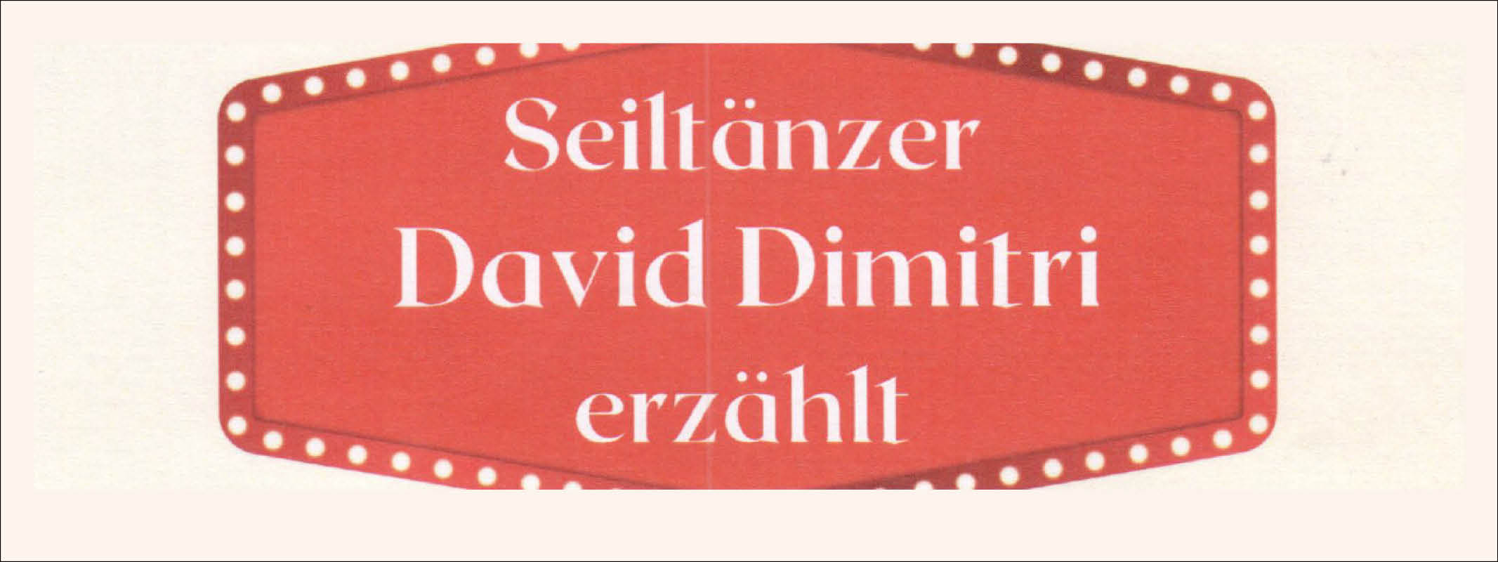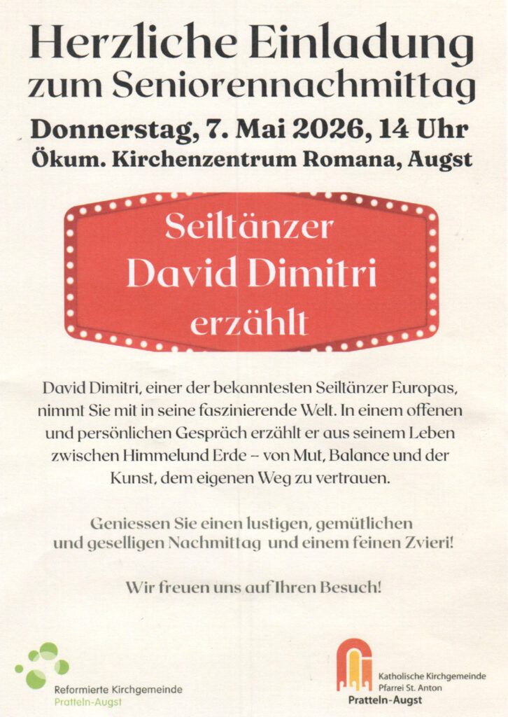 David Dimitri, einer der bekanntesten Seiltänzer Europas,nimmt Sie mit in seine faszinierende Welt. In einem offenenund persönlichen Gespräch erzählt er aus seinem Lebenzwischen Himmel und Erde – von Mut, Balance und derKunst, dem eigenen Weg zu vertrauen.Geniessen Sie einen lustigen, gemütlichenund geselligen Nachmittag und einem feinen Zvieri!Wir freuen uns auf Ihren Besuch!